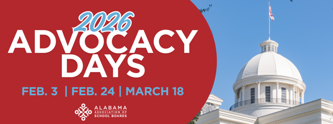 Join us in Montgomery for AASB's 2026 Advocacy Days. Don't miss this opportunity to meet with your local legislators to discuss key issues impacting public education. You'll also learn how to sharpen your advocacy skills and have time to share information and network with colleagues from across the state.