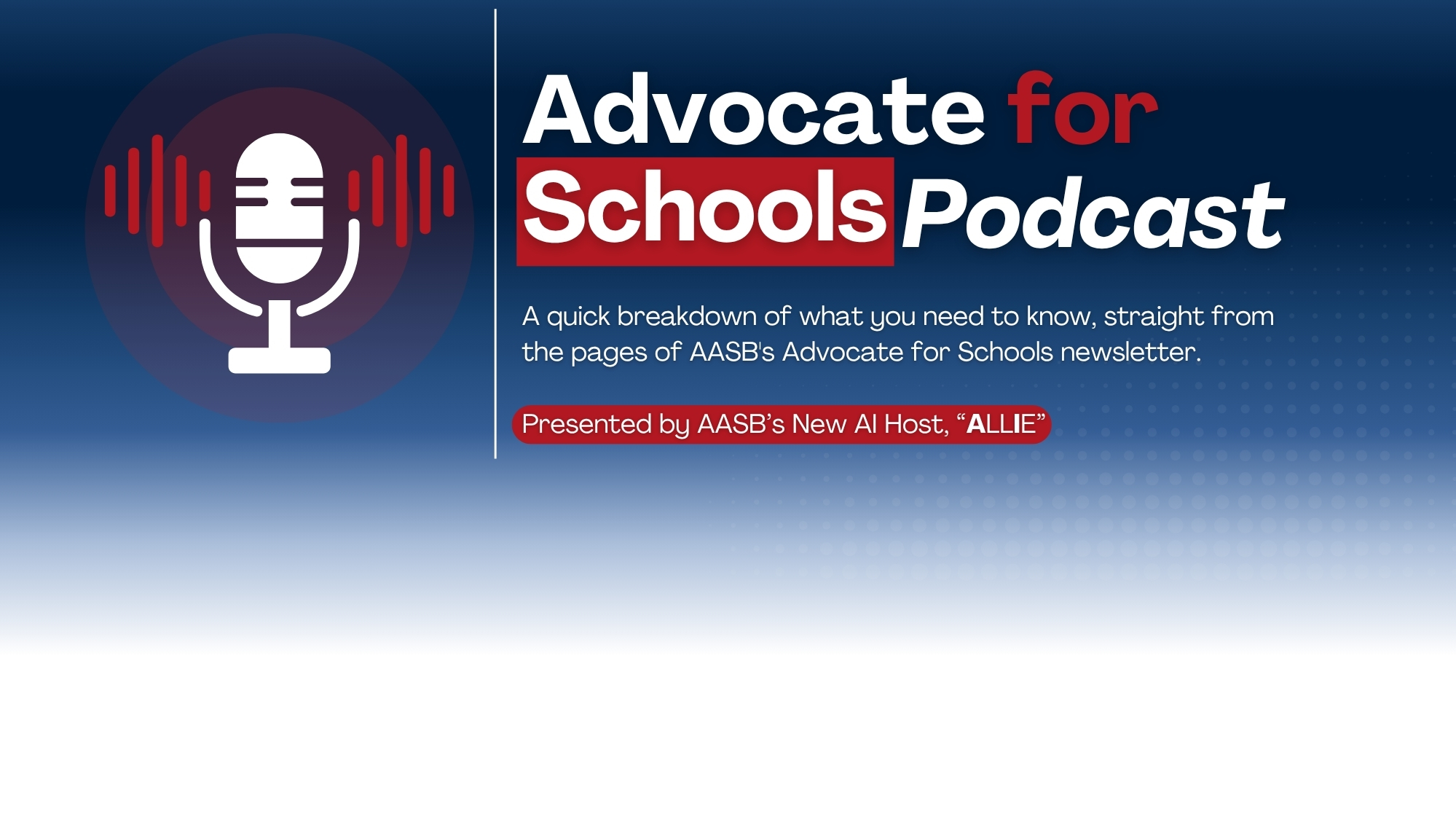 "Allie" is AASB's official artificial intelligence team member and the voice of the Advocate for Schools Podcast. Each week during the Alabama Legislative Session, "Allie" translates AASB's Advocate for Schools newsletter into a digestible audio update for school board members and education leaders across the state.